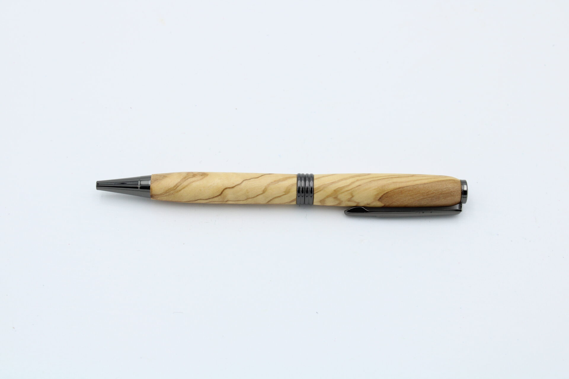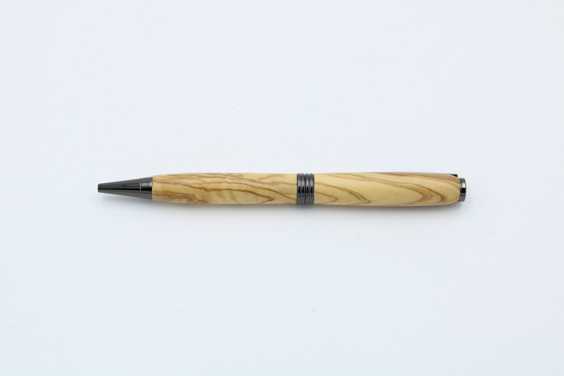 Drehkugelschreiber Modell “Streamline” aus Olivenholz und Messing in Gunmetal-Optik.
