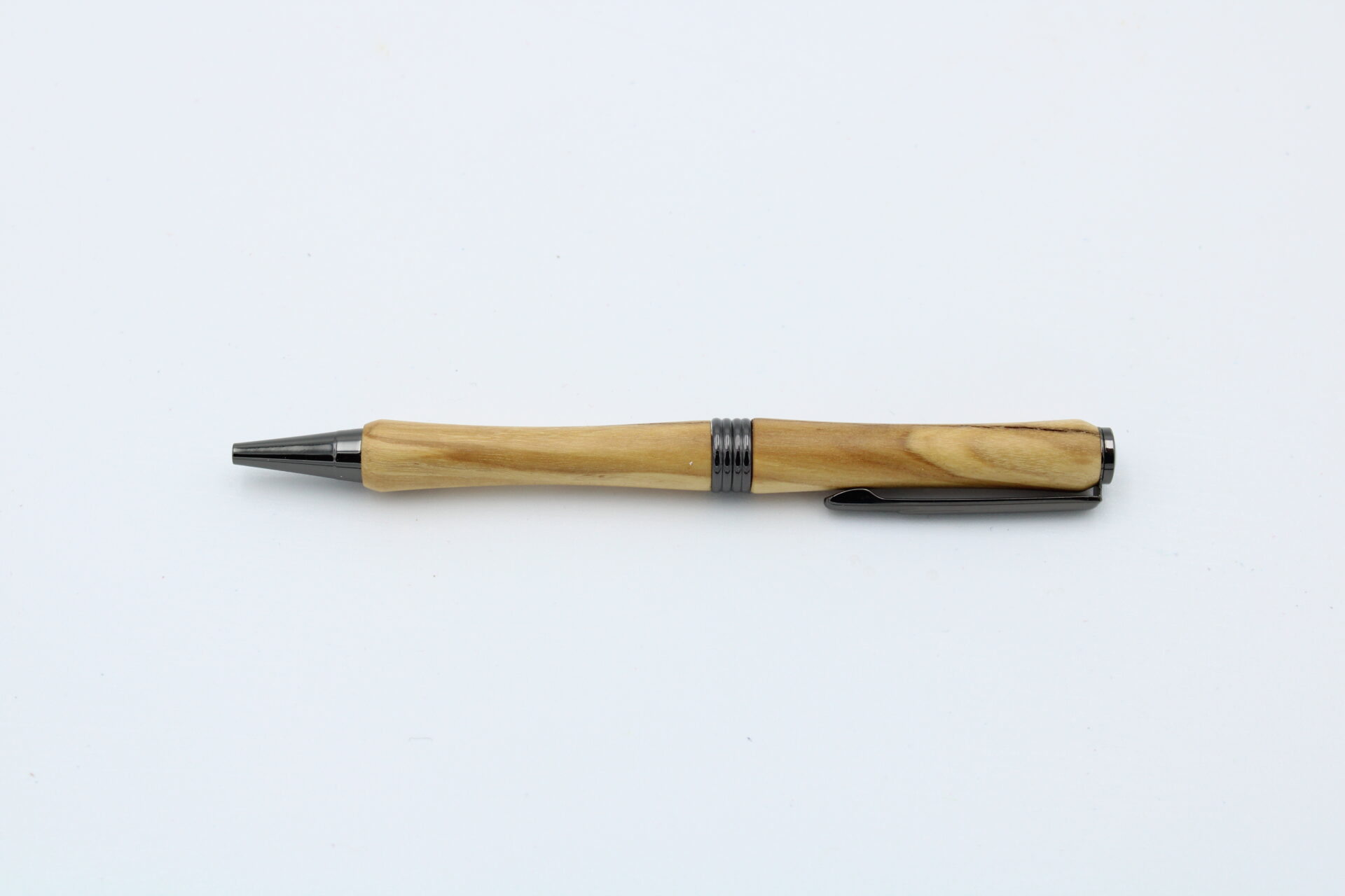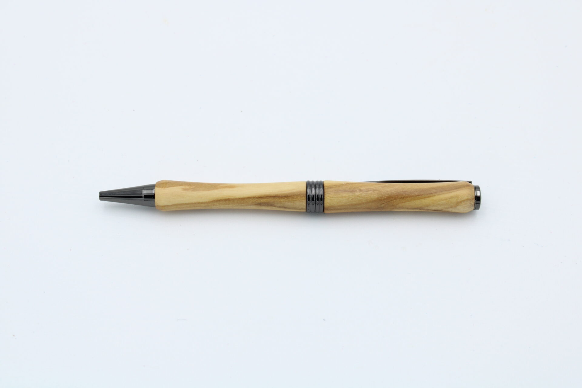 Drehkugelschreiber Modell “Streamline” aus Olivenholz und Messing in Gunmetal-Optik.