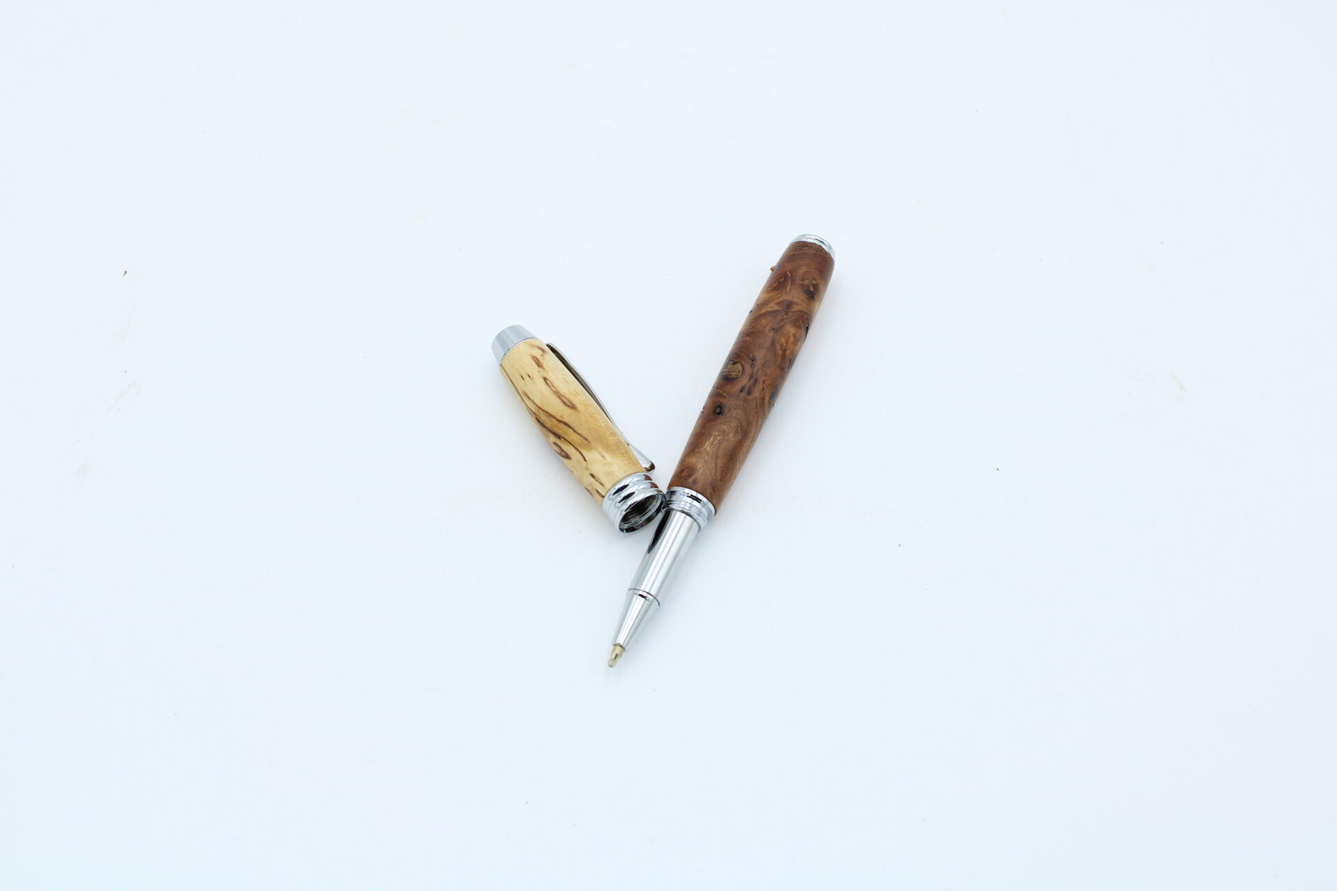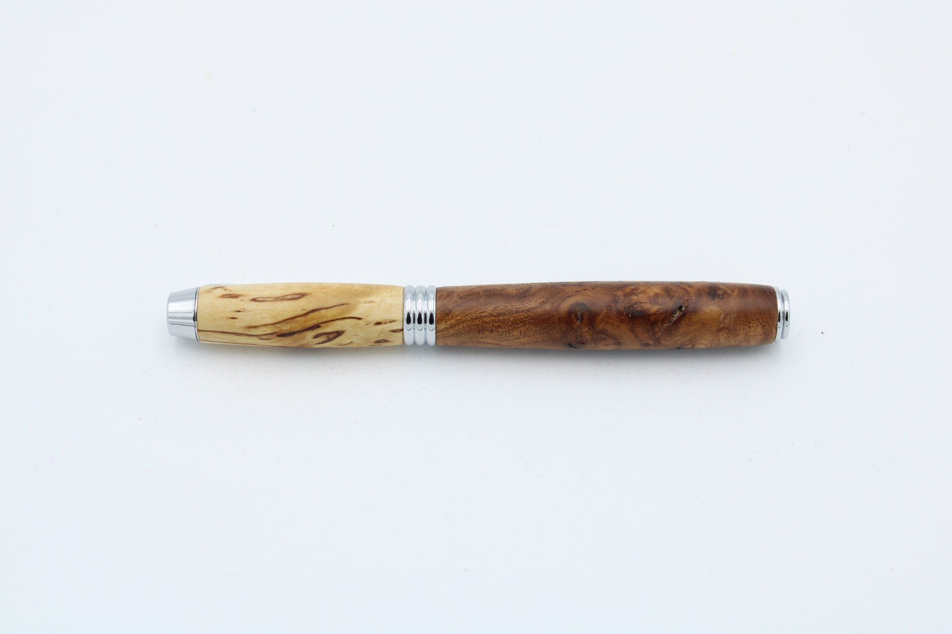 Rollerball Modell “Manager” aus Maserulme/Maserbirke und verchromten Messing.
